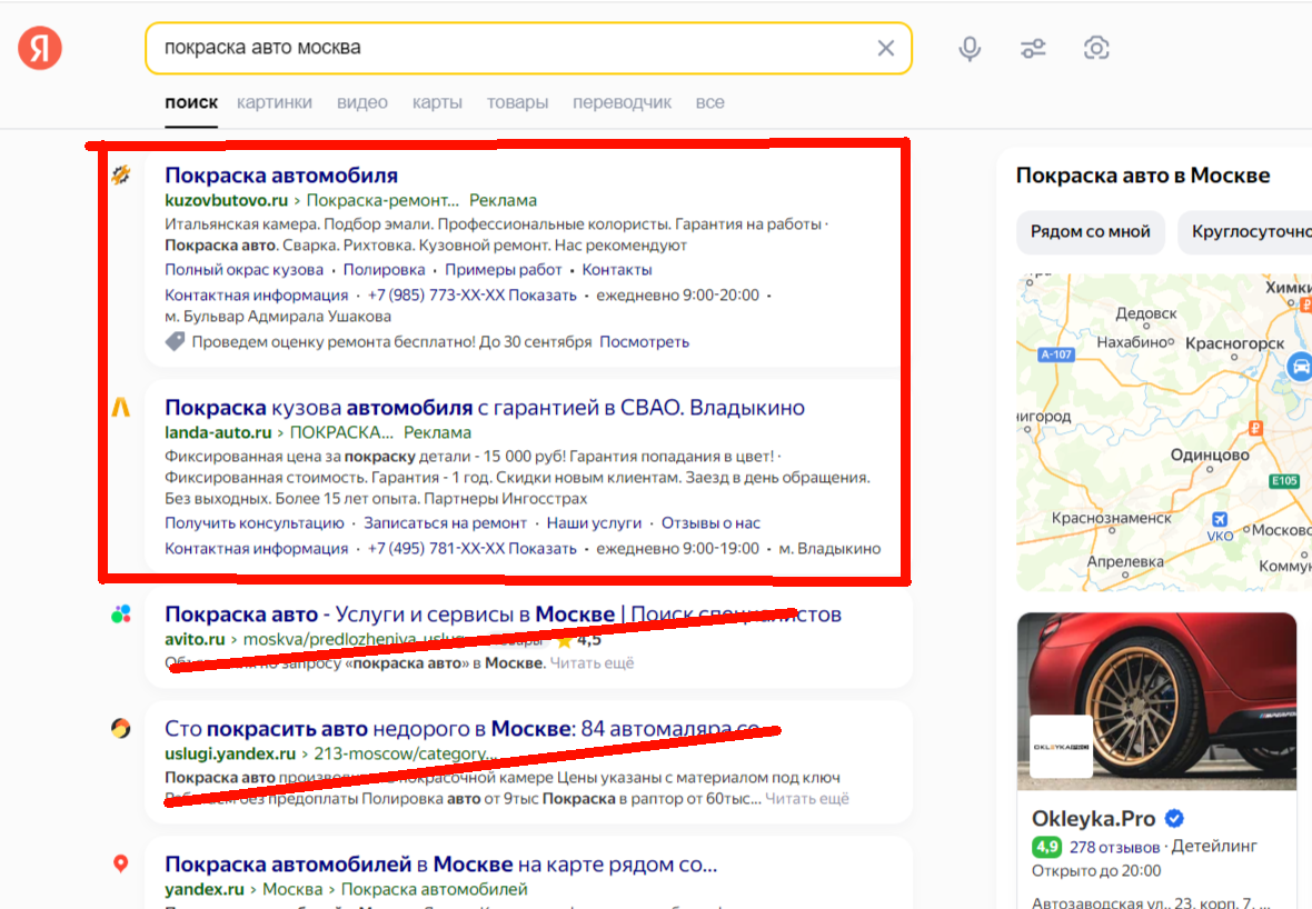 Пример: у тебя автосервис в Москве, который специализируется на покраске автомобилей. Вводишь в поисковую строку запрос «покраска автомобилей Москва» и смотришь сайты, которые попали в топ-10. Для анализа можно взять 3-4 сайта из верхних позиций и 4-5 сайтов с нижних позиций. Таким образом ты сможешь получить полную картину конкурентов, работающих в этой нише.