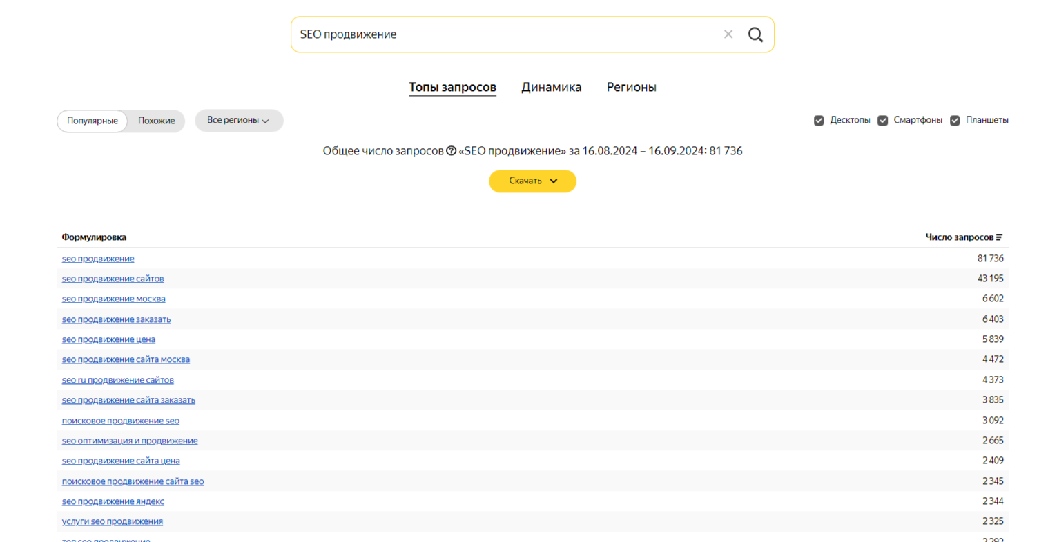 Существуют инструменты, такие как Яндекс Вордстат, которые помогают определить релевантные ключевые слова, а также их эффективность по объему поиска и сложности ранжирования. Это важный этап SEO-продвижения в Яндекс и его не стоит пропускать, особенно если ты ориентирован на русскоязычную аудиторию.