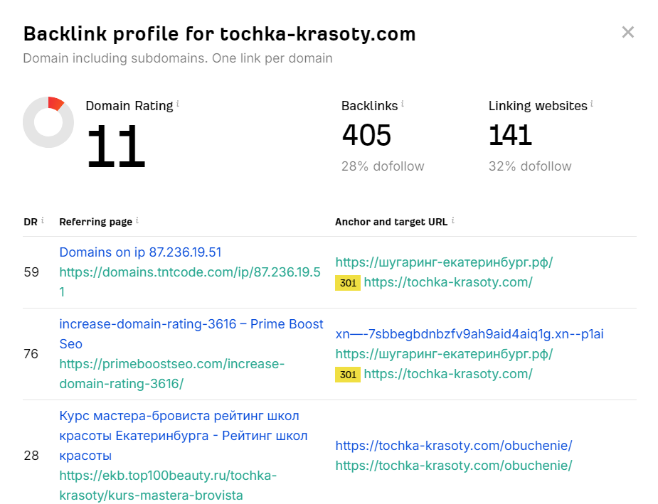 - Domain Rank (DR) — показатель авторитетности домена. Хороший DR для доноров — от 10 до 30.
